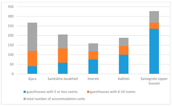 There are no accurate statistics on rural or agritourism in Georgia. However, the proportion of small guesthouses in rural regions, as shown in Figure 5 and Figure 6, is a good indicator of the relative significance of regional tourism’s development. The percentage of registered accommodation units with five or less rooms in rural areas of Georgia is 43% of the total accommodation and about 11.5% of all tourism beds in rural Georgia [24].
