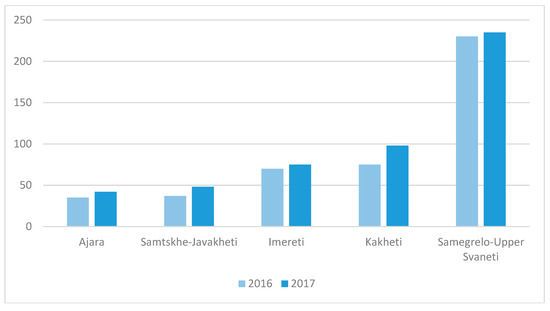 The increase in guesthouses with less than five rooms in five regions of Georgia. Source: Georgian Tourism in Figures (2016, 2017). GNTA.