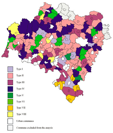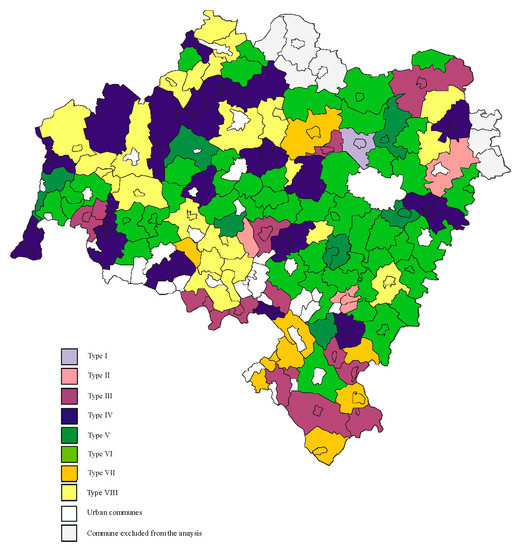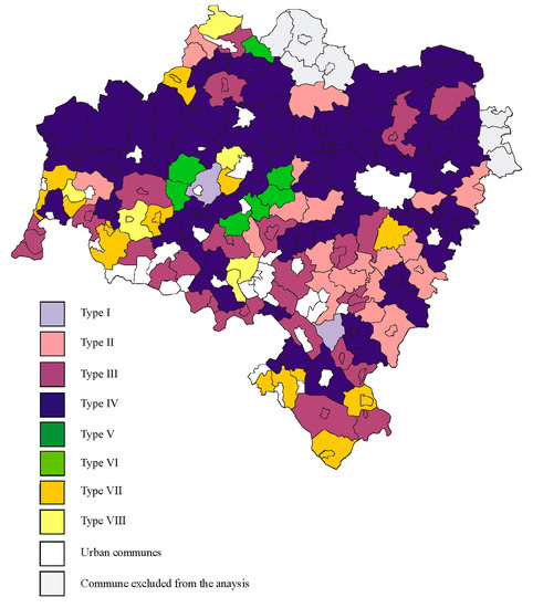 Analyzing land use changes generally requires an integrated approach that considers multiple disciplines, data sources, and methodological constructs [40]. The adopted criteria allowed the identification of eight types of municipalities, which are briefly characterized below. The adopted criteria were compiled in a tabular form (Table 1) and on their basis eight functional types of rural municipalities were identified. The symbol “+” stands for meeting the boundary criterion, i.e., “over 25%” or “over 1 bed/km2” while the combination of the particular assumed conditions creates a given type.