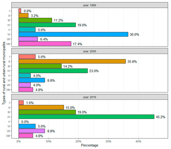 - the percentage of Type VI municipalities (municipalities dominated by agriculture, without developed tourist infrastructure, almost without industry) was higher in 1996 than in 2005 and 2016;