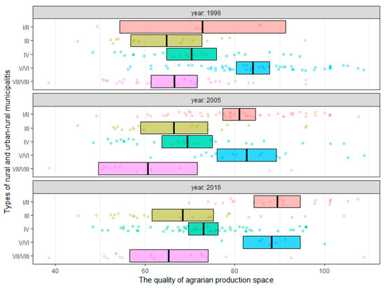 The results of the analysis of variance indicate that, in all three analyzed periods of time, the statistically significant differences between the types of municipalities, in terms of the quality of agricultural area, were recorded. In 1996, Type V/VI municipalities were characterized by a higher quality of agricultural area against the other types of municipalities (except for I/II) (A very wide confidence interval (shown in Figure 3) regarding the mean value in type I/II municipalities is worth emphasizing. This was due to the fact that, in 1996, there were only five observations in the group of I/II municipalities, which had only five observations.). In the situation of industry decline a return to the agricultural function of the municipality that took place—Type V and VI municipalities are dominated by agriculture. The function of the regions focused on agricultural production by taking advantage of high soil quality for this purpose. In turn, in 2005 and 2016, type I/II and V/VI municipalities were characterized by a higher quality of agricultural area against the municipalities of other types (Types I and II represent industrialized municipalities, dominated by agriculture, Types V and VI—municipalities dominated by agriculture, almost without industry). Figure 7 presents the graphical interpretation of the analysis of variance.