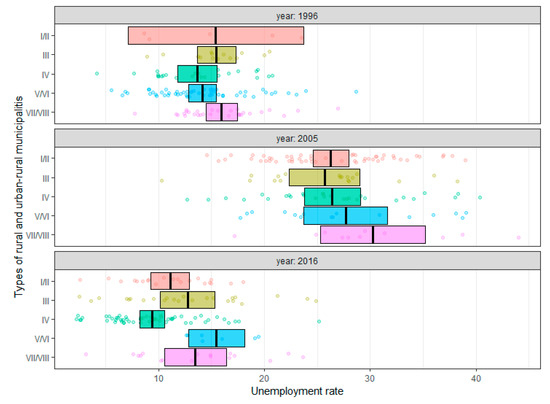 The analogical procedure was used to examine whether the municipalities of particular types differed in terms of the unemployment level in 1996, 2005, and 2016. The analysis results are presented in Table 7 and in Figure 8.