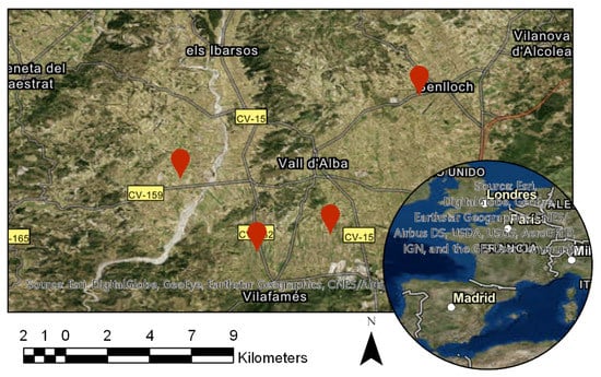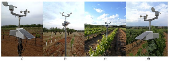 Data were collected at four different vineyard smallholdings located in the province of Castelló (Spain) (Figure 1). These data were then used to evaluate the selected models (see Section 2.2). All these models use meteorological data generated by low-cost meteorological stations. To achieve this, the IoT nodes described in [11] (SEnviro) were used. These nodes contain low-cost sensors to monitor meteorological phenomena such as temperature, air/soil humidity, wind speed, wind direction and rainfall.