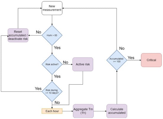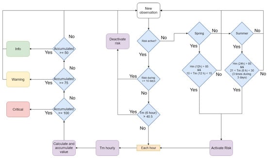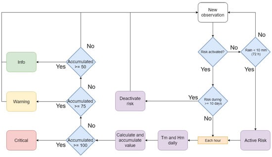 Figure 4 defines the work-flow used to follow the adapted Goidanich model. When a new observation is generated, the first step is to check whether the accumulated (aggregate of 72 h) rainfall exceeds 10 mm. If the aggregate rainfall does not exceed this value, the model waits until a new observation; if it is reached, the risk alert is activated. Once the risk alert has been activated, temperature and humidity are calculated hourly following Table 2 to calculate the accumulated value. Depending on this value, the model will launch different types of alerts. If the value is higher than 50%, an Info alert is generated; if the value is higher than 75%, a Warning alert is issued; and if it is equal to or greater than 100%, a Critical alert is produced. After a critical alert, the model will restart. The development of the fungus restarts and remains in suspension until the product has been washed away by rain. If the model has not reached a value of 100 after 10 days, the algorithm is restarted.