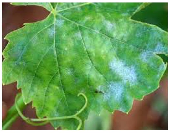 Like Downy mildew, Powdery mildew is another type of fungus that affects grapevines, among other crops. The causative fungus is Uncinula necator Burr., originally from North America, but widespread throughout Spain. This fungus causes significant damage to the strain that becomes infected, and can produce total or partial loss of foliage and fruit [18]. This disease resides in the strain all year round. The fungus of Powdery mildew is found inside the shoots and the vines during the winter and then goes to the outside during the beginning of sprouting. In the following, we define the main symptoms when it is activated: