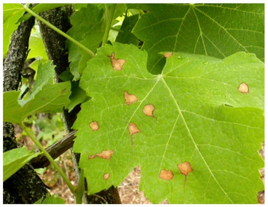 - Erincik, O.; Madden, L.; Ferree, D.; Ellis, M. Temperature and wetness-duration requirements for grape leaf and cane infection by Phomopsis viticola. Plant Dis. 2003, 87, 832–840. [Google Scholar] [CrossRef]