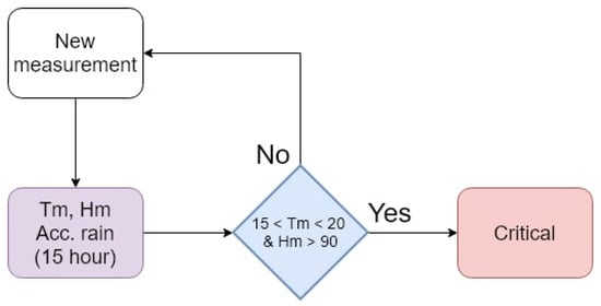 Figure 8 defines the workflow for following the adapted Black rot model. The original model defined in [20] is based on humidity and temperature phenomena.