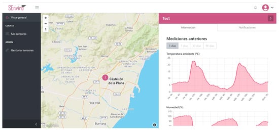 The models detailed above were developed within the SEnviro Connect platform described in [21]. In general, this platform is responsible for collecting the observations from the IoT nodes. In addition, it stores and processes the data to be analysed as time series in real-time. To do so, a time series database called Influx is used [22], which allows the models to be defined and followed through its Kapacitor complement [23], and when a real-time observation comes from the sensors, it is analysed by following the models. If a possible alert is detected, Kapacitor is capable of propagating this alert, and this capability was used to develop a (mobile responsive) web application in Figure 11. The farmers, in addition to seeing the weather conditions in real-time, are also able to receive the alerts generated by the IoT nodes located on their smallholdings.