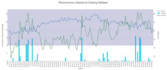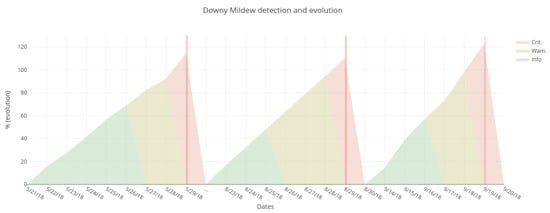 The model used to warn for Downy mildew disease, as detailed in Section 2.2, was the Goldanich. This model needs three different meteorological variables (temperature, humidity and rain) as inputs to run. Figure 12 shows the evolution of these three meteorological variables during the defined period. The Goldanich model is activated when 10 mm of continuous rain (over 72 h) is reached. According to the chart (Figure 10), this value was exceeded three times (21 May 2018, 22 August 2018 and 13 September 2018). The model was activated on these three dates.