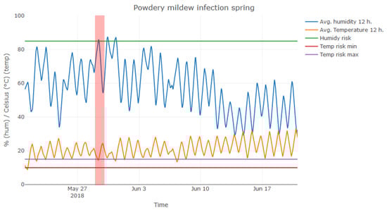 Figure 14 shows a possible infection on 29th May (in red in the graph) during the spring period. During the summer period no infection was detected (Figure 15), and the average humidity only exceeded 85% on one day.
