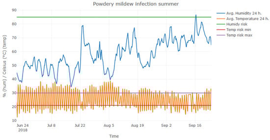 The next disease is Powdery mildew, which, depending on the season (spring or summer), has different characteristics to start the model. The model works mainly with temperature and humidity phenomena. Figure 14 and Figure 15 show the evolution of these variables for the period 21 May to 20 June (spring) and from 21 June to 20 September (summer), respectively. The green line indicates the value that the humidity must take (85%) to activate the infection and the purple and red lines indicate the thresholds of the temperature needed to produce the infection. Both thresholds and the hour of aggregation vary depending on the season of the year.