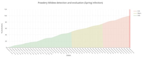 Figure 16 follows the model once the first infection is detected. The figure shows the evolution of the accumulated value. The evaluation was never stopped because the hourly average temperatures did not exceed the value of 33 C. The infection after 9 days of follow-up reached the threshold of 100%, so it can be considered that the infection is present in the field. It should be noted that the farmer has received different alerts depending on the accumulated value (information alert at 50%, warning at 75% and critical at 100%).
