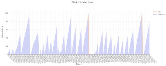 Figure 17 shows all the different detections of Black rot. Altogether, the model started 30 times and calculated accumulated values until the model itself stopped the evolution because the average humidity decreased below 85% and the model resets the accumulated value. The model obtained a possible infection and accumulated a value up of 100% only twice. These infections were reported on 17 August 2018 and 18 September 2018; this latter date was after the harvest had been collected. In this model, only one type of alert is defined since the model indicates that there is a possible infection, not a reproduction as in the previous models.