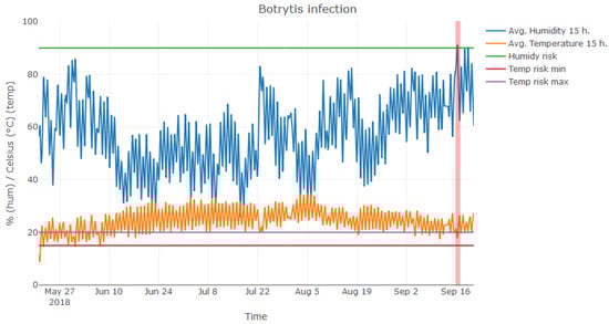 The last follow-up of a disease is Botrytis. For this disease, two phenomena are involved: temperature and humidity. When a new observation arrives, an aggregation of the last 15 h is calculated. Figure 18 shows the evolution of both these phenomena. The different thresholds fixed by the model are shown in the chart (Figure 18). Only one detection was reported, and it occurred on 17 August 2018 and 18 September 2018; during this period the harvest had already been collected.