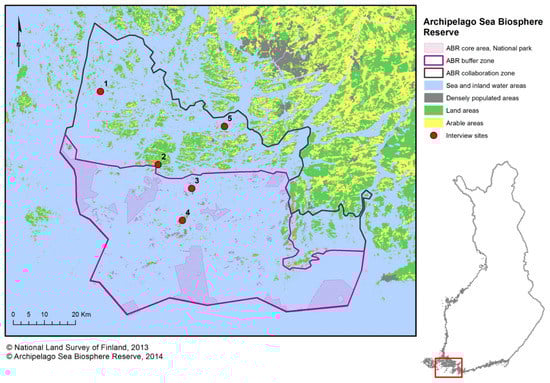 Voluntary ABR visitors and summer residents assessed the appreciation of the habitats and their linkages to ES delivery through structured interviews. The interviews were arranged during the summer holiday season, in June and July 2013. The ABR visitors were surveyed using a theoretical sampling strategy [] to represent different opinions. Here the aim was to collect a sample to cover maximum variety, rather than to achieve statistical representativeness. The interviews were situated in five popular recreational areas and market places within different zones of the ABR, in the Pargas (Parainen) municipality (see Figure 1). The interview questions focused on the respondents’ personal opinions and perceptions; i.e., they answered based on their experience and knowledge of the ABR habitat types and their functions.