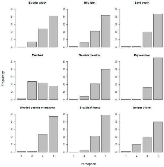 Also, a subjective connection to place can contribute to the positive perceptions amongst the visitors. Many respondents had summer residence in the ABR, and some of them usually stayed in the region for longer periods of time, claiming to have good knowledge of the area. These people are likely to have a close personal relationship to the ABR. For those respondents less familiar with the ABR, the restricted accessibility due to ABR infrastructure limitations likely has an effect on the results. Certain habitat types (e.g., bird islets and bladder wracks) are difficult to reach and others are extremely rare (e.g., wooded meadows); thus, respondents may have limited experience on the ESs these habitats sustain. Yet, high importance was given to generally well-known or otherwise distinct links between the habitats and the ESs. This might be the case, for example, with bladder wrack and water quality, as bladder wrack is an indicator of water purity []. Also, the scenic beauty, the significant cultural value, and the high biodiversity of meadows and wooded pastures is established [], and our results confirm this from the ABR visitors’ point of view.