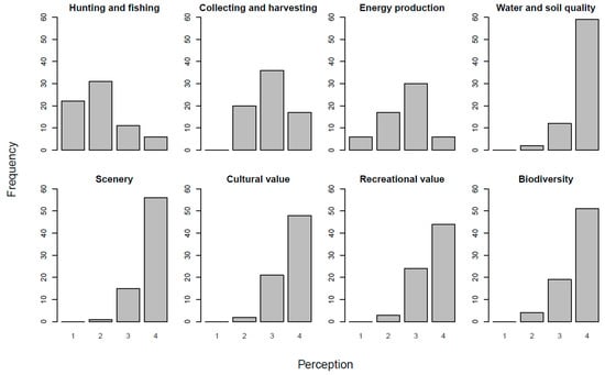 Respondents’ perceptions of the importance of the selected ecosystem services (ESs) and biodiversity. The x-axis is according to an increase in importance: not important (1) slightly important (2) somewhat important (3) very important (4).