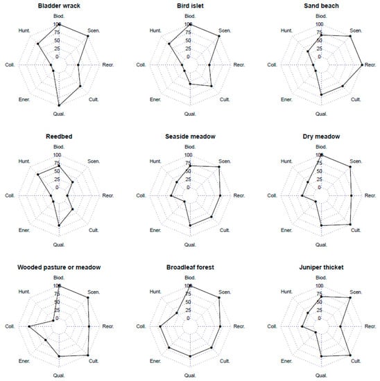 Aesthetic sceneries were found to be the key habitat-related ES among all listed services, being evaluated as very important in all other habitats except in reedbeds. Furthermore, in most studied habitats, scenery was evaluated as a very important ES together with some other ES. In juniper thickets, dry meadows, wooded meadows and wood-pastures aesthetic scenery was linked to cultural value. In sand beaches and bladder wracks, scenery was appreciated together with recreational value and water quality, respectively. In general, the habitats contributed to the provision of sceneries, cultural values, and regulation services. Therefore, the ESs that were evaluated most positively by the respondents (Figure 3) had the highest importance in the habitat-specific profiles (Figure 4).