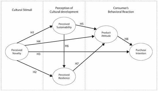Also, the role of TCPs in the contemporary cultural context is profoundly shaped by people’s attitudes on a large scale [31]; culturally innovative products can be an essential stimulus to influence consumers’ perception towards the cultural development with the local identity. Moreover, empirical studies were conducted to compare user satisfaction regarding different cultural levels, which show that inner “intangible” culture is more effective in enhancing users’ cultural satisfaction [15]. Therefore, it has become crucial for developing cultural sustainability by improving consumer attitudes regarding cultural products. The culturally innovative products referring to the inner level element derived from TCPs is examined through perceived product novelty [32], the details of this are presented in Section 4. The perceived sustainability and resilience of TCPs are investigated to support the consumers’ understanding of culturally sustainable development. In Section 2.2 and Section 2.3, we describe the two terms of the perceived sustainability and resilience. Thus, we formulate the following four hypotheses based on the prior research findings presented above: