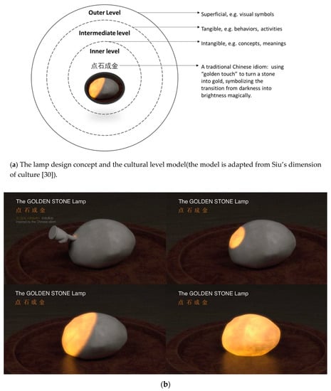 (a) illustrates how this selected design of culturally innovative product fits the inner cultural level of TCPs; (b) illustrates the detailed process of the “点石成金” Lamp design. After a user touches the surface of the stone-like lamp, the golden glow is gradually illuminated. It corresponds to the meaning of “touch a stone and turn it into gold.” This concept from the traditional Chinese idiom is meant to symbolize the subtle and magical transition from the darkness into brightness.