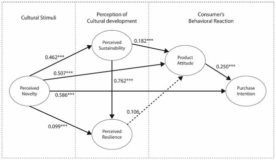 The chief aim of this study is to understand what the effects are of the perceived novelty of culturally innovative products on perceptions of the sustainability and resilience of TCPs, thus influencing consumer behavior. In order to analyze the relationship in the research framework, we conducted a path analysis based on the Structural Equation Model (SEM). Figure 3 shows the output of this analysis and Table 6 shows the standardized coefficient of each path and the results of the hypotheses.