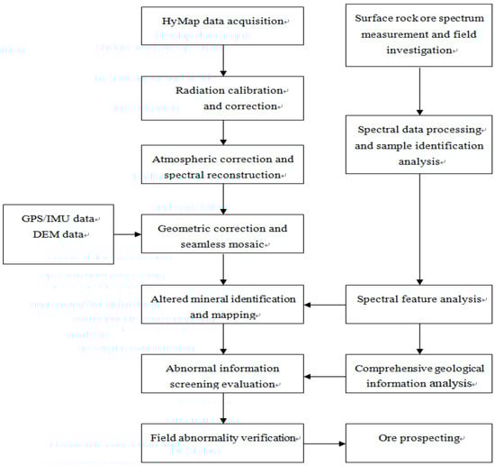 In the development of an airborne imaging spectrometer, Australia’s imaging spectrometer HyMap has been recognized by the industry for its excellent SNR performance. Huo et al. used HyMap data to extract Al-rich muscovite and Al-poor muscovite in the copper-mine area of eastern Tien Shan []. Rodrigo dos Reis Salles et al. also used HyMap in Queensland to find the occurrences of goethite, kaolinite and montmorillonite and determine their zonal relationship with U-REE mineralization, particularly when combined with other exploration methods []. A relatively small amount of research has been carried out in China using HyMap data, especially based on the relationship between spectral absorption characteristics and mineral abundances. A flowchart of the study is presented in Figure 1; the overall workflow is as follows: (1) Data acquisition, (2) data pre-processing, (3) typical mineral spectral characteristics analysis, (4) preliminary extraction of altered mineral information, (5) hyperspectral mineral mapping, (6) abnormal information screening intensity analysis, and (7) field verification, (8) ore-prospecting prediction. The main research areas in this paper include: (1) Using spectral absorption characteristics and prior knowledge of mineral spectra to map altered mineral abundances, (2) analysing mineral abundances (sample spectra collected by field investigation) and spectral absorption characteristics, and (3) predicting potential deposits in the study area.