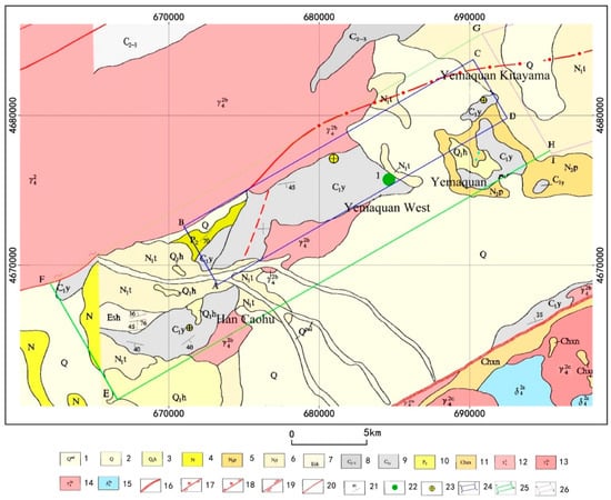 Regional Geological Map (according to the China Non-ferrous Metals Resource Geological Survey). 1. Hong alluvial gravel, sand; 2. Fluvial gravel; 3. Grey conglomerate formation; grey conglomerate sandstone lenses; 4. Red sandstone, conglomerate and mudstone; 5. Grape Valley Formation: Paleo, brown conglomerate and sandstone; 6. Peach Circle Formation: Brick red clay, silty sandstone, argillaceous rock, and conglomerate; 7. Shanshan Formation: Reddish purple conglomerate, arkosic conglomerate, siltstone; 8. Grey-green, grey, grey-black, fine conglomerate, tuff, silica, mica-quartz schist, fine bijire, quartz porphyry, limestone; 9. Masamitsu Formation: Phyllite, feldspathic porphyry, quartz porphyry, quartz-albite dacite, clastic tuff with fine boulders, limestone, sandstone; 10. Brown granite sand, conglomerate, sandstone; 11. Xingxingxia Formation: Light grey, grey-green biotite plagiogneiss, mixed rock, quartzite, marble, sparry limestone; 12. Deep red granite; 13. White muscovite granite; 14. Light grey biotite granite; 15. Diorite, quartz diorite; 16. Regional major fault; 17. Reverse fault; 18. Normal fault; 19. Translational fault; 20. Inferred fault of unknown nature; 21. Underlying formation; 22. Copper mine; 23. Gold mine; 24. Outline of completed 1:50,000 range of laser scanning; 25. Outline of 2015 designed 1:50,000 range of laser scanning; 26. Outline of 2016 designed 1:50,000 range of laser scanning.