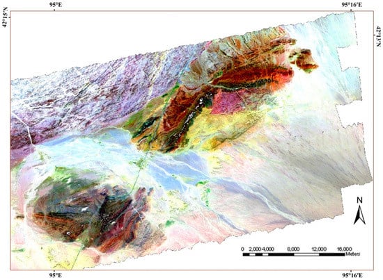 The application of hyperspectral remote sensing technology was originally used for geological mapping by geologists [,,]. With the rapid development of high-tech, hyperspectral geological application technology has also made great progress [,]. Tong Qingxi et al. [] and Li Zhizhong et al. [] summarized the applications of hyperspectral geology and classified them into: (1) spectral differential techniques, (2) spectral matching techniques, (3) mixed spectral decomposition techniques, (4) spectral classification techniques, (5) spectral feature extraction, and (6) model methods. The visible and near infrared (VNIR) and shortwave infrared (SWIR) wavelengths region are mostly used in geological applications on the basis of previous literature [,,]. Due to the different temperatures and spectral channels of minerals, thermal remote sensing can discriminate these regions efficiently.