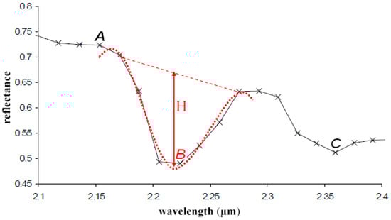 The mineral mapping of the study area is based primarily on the diagnostic absorption band measurement method [,]. Based on a programmable feature extraction processing channel, the script for this channel is designed for extracting spectral parameters (absorption depth, wavelength, width, asymmetry). First, the image spectral data are pre-processed (mean normalization, de-continuation, convolution smoothing), and second, the feature parameter extraction is done (feature depth, feature area, feature width, minimum wavelength, ratio, arithmetic, and logic operations) (Figure 4) [,,,]. Therein, the absorption band-position is located at point B, which has the minimum value of spectral reflectance in the whole spectral region. In addition, the spectral absorption band-depth H is defined as the distance between point B and the non-absorption baseline, which passes through the two shoulders A and C.