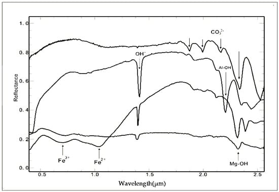Metal cations affect the visible light characteristics of altered minerals, while several functional groups vibrate in the near infrared range, mainly including Fe2+, Fe3+, Al-OH, Mg-OH, OH− and CO32− [,,,]. (1) Spectral absorption characteristics of iron ions: The characteristic absorption peak of Fe3+ ions is mainly 0.60–0.80 μm (Figure 5), the centre position is about 0.70 μm, while the characteristic absorption peak of Fe2+ ions is mainly 0.90–1.50 μm, and the centre position is about 1.20 μm [,,].