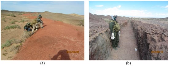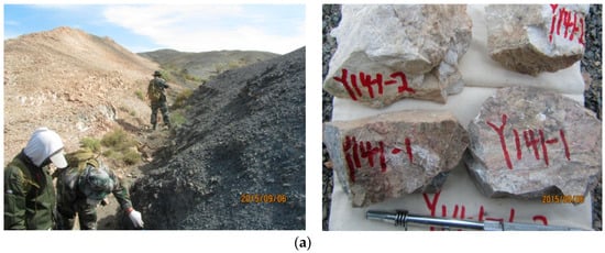 Terrestrial spectral measurement provides certain surface spectral data support for the processing of airborne hyperspectral data [], and provides guidance for the extraction of alteration mineral information from airborne hyperspectral data. Spectral Evolution’s PSR spectrometer was used to measure and collect the surface spectral data of rocks of different lithologies and different alteration types in favourable geologic units in the study area. The main technical parameters of PSR can be described as follows: the working spectral region ranges from 0.35 μm to 2.50 μm, the spectral resolution is 3.50 nm, the spectrum sampling interval is 1.50 nm, it enables full spectral range data acquisition of 100 milliseconds, up to 10 acquisitions per second. The test samples primarily include rock, and different crystal forms of the same type of mineral can be distinguished. The favourable geologic units for prospecting work in the study area include the lower Carboniferous Mansou Su Group (C1y) quartz porphyry (λπ) or diabase bodies, sillimanite bodies (βμ), and so on. In addition, many Au and Cu geochemical anomalies are distributed in the area, which are mainly clustered in known deposits and near ore mineral occurrences or along ductile shear zones and fault structures. Therefore, this survey considers ductile shear zones and faults, structural belts, and other structural development sites.