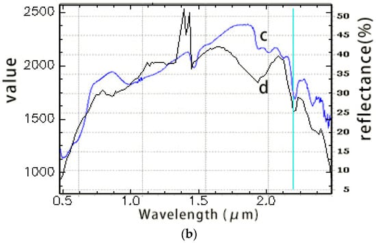 (2) Spectral absorption characteristics of hydroxyl groups: Some hydrous minerals contain hydroxyl groups that have absorption peaks around 1.40 μm and 1.90 μm [,]. The most significant characteristic absorption peak of Al-OH minerals is the 2.15 to 2.22 μm peak, while some secondary absorption peaks on both sides constitute a “dual structure”. The mineral absorption characteristics of Al-OH containing minerals are shown in Table 3. The most significant absorption peak of Mg-OH minerals is in the region of 2.30 to 2.39 μm. The absorption peak positions of minerals containing Mg-OH are shown in Table 4.