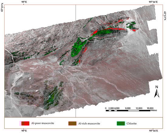 The study area belongs to a region containing an intracontinental, tectono-magmatic, stacked ductile shear zone related to gold deposits. Based on the alteration mineral assemblage produced by endogenous metalliferous deposits, we can see that the combination of Hymap hyperspectral mineral mapping, field verification and existing exploration work shows that shear zones are closely associated with mineral assemblages related to gold (Figure 8, Figure 9, Figure 10, Figure 11, Figure 12 and Figure 13). Particularly, according to the absorption characteristics observed in the Al-OH spectrum, the light-colored mica minerals can be classified as Al-rich muscovite or Al-poor muscovite. Al-rich muscovite underwent intensive alteration and the minerals of mica, including muscovite and illite, and accompanied by pyrophyllite and fine-grain quartz, were altered. In contrast, Al-poor muscovite underwent medium alteration, and the minerals altered were predominantly illite and andreattite, and accompanied by more chlorite and minor laumonite. Al-rich muscovite identified in hyperspectral images may have formed in a hydrothermal fluid environment with comparatively high temperatures and slight acidity. The Al-poor muscovite formed in a fluid environment of comparatively low temperatures and slight alkalinity. The main mineral information extracted from the HyMap data, located in the vicinity of 2.192 μm with shoulders in the vicinity of 2.156 μm and 2.297 μm, was pertaining to Al-rich muscovite. In addition, the mineral information extracted from the airborne data for mineral located in the vicinity of 2.21 μm, with shoulders at 2.174 μm and 2.262 μm, is mainly presented as Al-poor muscovite.