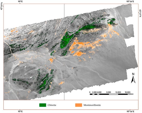 - Chloritization: It is mainly distributed in schists, volcanic rocks, and altered fracture belts, and co-exists with epidotite. It is distributed over a large area, and is easy to identify using the hyperspectral method.