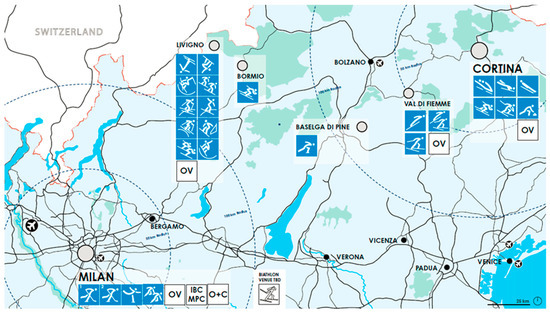 Venue Masterplan of the Milan/Cortina d’Ampezzo bid for hosting the 2026 WOG, indicating the proposed sites and venues [85] (p. 155).