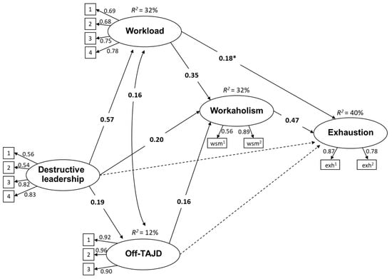 Table 2 presents results of the models. The hypothesized model, in which workload and off-TAJD were partial mediators between destructive leadership and workaholism, and workaholism partially mediated the relationship between destructive leadership, workload, and off-TAJD, on the one hand, and exhaustion, on the other, showed a good fit to the data (M1; Fit: χ2 (106) = 246.40; p < 0.01; RMSEA = 0.06 (0.05, 0.06); CFI = 0.96; TLI = 0.95; and SRMR = 0.05). Furthermore, according to the results, M1 was significantly better than the direct effects model (M2), in which all direct effects from destructive leadership, workload, off-TAJD, and workaholism to exhaustion were calculated; thus, the presence of mediating effects in the model was confirmed (Δχ2 = 7.56; p < 0.05).