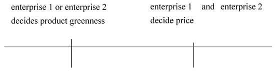 Assuming that the information of two enterprises is completely symmetrical, they make decisions simultaneously according to the maximization of their own interests, and the game process is divided into two stages. The first stage: the research and development stage, the enterprises determine the green innovation level of the product; the second stage: the production and marketing stage, simultaneously carrying out product pricing, as shown in Figure 1.