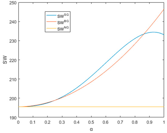 Firstly, we study the effects of the proportion of green consumers (i.e., ) on social welfare. Let range between 0 and 1; our numerical analysis uses the following values to establish ranges for model parameters: , , , , , , and . Figure 2 can be obtained through MATLAB simulation.