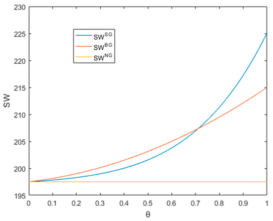 Secondly, we investigate the effects of the degree of consumer green preference on social welfare under three circumstances. Let range between 0 and 1, then, we keep the following parameters with values fixed: , , , , , , and . Figure 3 can be obtained through MATLAB simulation.