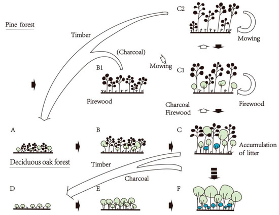 Scheme of a traditional utilization and succession series of Satoyama forests in Japan. The blank arrows signify the utilization and the solid one indicates succession (Redraw from [51]).