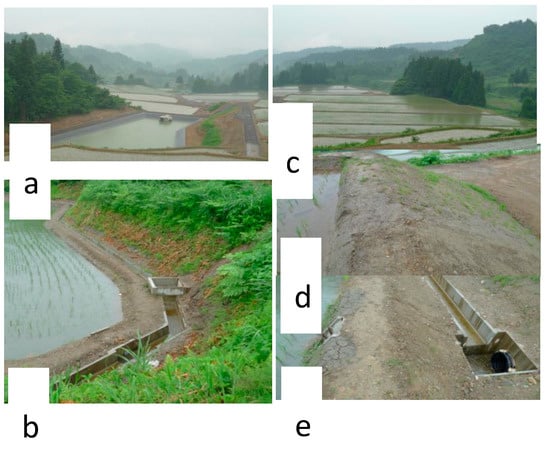 Consolidated farmland, irrigating system, pond, and road. (a), (b), (c), (d), and (e) are consolidated pond bank, rice paddy, irrigation canal, paddy levee, and drainage pipe in Niigata Prefecture, respectively.