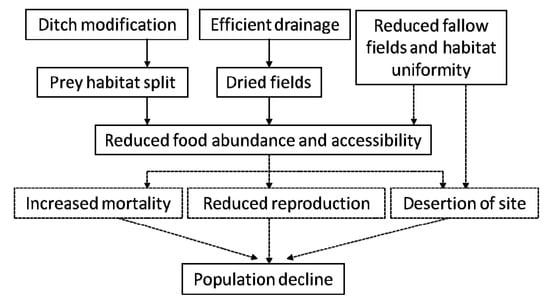 To sum up, the consolidation of all kinds of “boundary” or narrow “corridor-like” components in Satoyama landscape did impact the species dependent on these marginal habitats. The evidence reviewed by Amano [35] (2009) from the earlier studies on effects of agricultural intensification on farmland bird species has shown the potential mechanism of population decline caused by the consolidation of ditch and drainage systems (Figure 5).