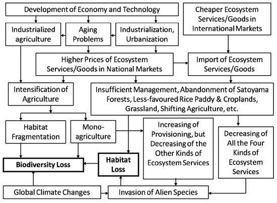 First of all, during the early 19th century (the late Edo and early Meiji eras), the whole society was entirely dependent on bio-resources and resulted in the overuse of Satoyama landscape, which caused serious soil erosion [88] and the decline of some species [89]. That was the first biodiversity crisis brought about by human activities and development [32]. Following the beginning of modern industrialization since the 1960s, the significant progress in economy and technology resulted in the development of industry that caused the immigration of younger generations from rural to urban areas in Japan. The aging problems of farmers in according with the higher purchasing power of citizens objectively increased the prices of ecosystem services and goods in the national market. The import of ecosystem services and goods in the international market caused the abandonment of Satoyama landscape (the second biodiversity crisis), and then led to the decreasing of ecosystem services as well as habitat loss for species. Wide use of fossil fuels and chemical fertilizers, and consolidation of agricultural facilities in industrialized agriculture can provide more food for humans, but they caused the fragmentation of habitats and the simplification of crop plants, as well as the decrease of other ecosystem services. Furthermore, global climate changes and degradation of Satoyama landscape led to the invasion of alien species (the third crisis). Eventually, the loss and fragmentation of habitats caused the biodiversity crises in Satoyama landscape of Japan (Figure 6).