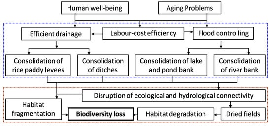 Compared to the habitat loss caused by abandonment of forests and grassland, the habitat loss and fragmentation in rice paddy fields and dry land are more serious, because the former can be easily recovered by re-utilization with traditional management. However, the latter completely modified the surface and underground water and nutrient flows by the construction of consolidated infrastructures that reduced the eco-hydrological connectivity and water regulating services. The dis-connectivity of water and nutrients flows within Satoyama landscape resulted in drier and poorer soils, which then caused the decrease of plants depending on more soil moisture and nutrients, and at last reduced biodiversity (Figure 7). Why did people or agricultural technological departments consolidate the farmland infrastructure but neglect the impacts of biodiversity? Taking the consolidation of rice paddy fields and rice production as an example, according to [90], the abandoned rice paddy was increased while the total planting area, the production, and consumption were all decreased continuously, but the rice yield is rising because of the consolidation of agricultural infrastructure. Indeed, 61.3% of rice paddy fields have been consolidated till 2007, which saved the working time for rice cultivation from 1463 hr/ ha in 1963 to 285 hr/ ha in 2007. This means that the consolidation of rice paddy fields can increase rice yield and reduce labor for rice cultivation simultaneously; namely, it can increase the provisioning services of rice products as well as human well-being. There is no doubt that pursuing higher human well-being is one of the ultimate aims of economic development, but biodiversity loss will ultimately hurt human well-being in the future. Therefore, the trade-off between human well-being and biodiversity conservation in Satoyama landscape still needs further study via interdisciplinary approaches.