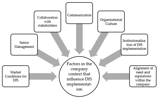 An illustration of different factors in the company context that influence the Design for Sustainability (DfS) implementation process as identified from literature.