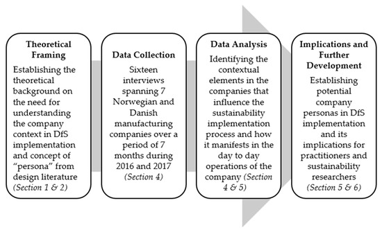 The number of interviews conducted for this study was 20 (including four interviews with sustainability experts). Among these, only one interview was conducted at Company B due to practical limitations. This disparity in the number of interviews provided a challenge in carrying out cross-comparative studies between different companies during the analysis phase. Additionally, one common criticism attributed to personas in design studies is the static nature of persona descriptions, which are not updated according to the changing needs of the user [65,66]. A similar challenge for company personas was also identified from the interview with SE1, where the respondent observed that companies do change their characteristics, if not rapidly, which necessitates a different approach to sustainability. A more in-depth study method such as action research in close collaboration with case companies is needed to accommodate such contextual changes of a company’s persona. Further, more detailed field testing with both quantitative and qualitative data sets [58] is required to increase the robustness of the “company persona” as a practical aid in DfS implementation. Thus, future work will involve empirical testing and improving the identified company personas through workshops in companies and among researchers who have worked with DfS implementation in companies.