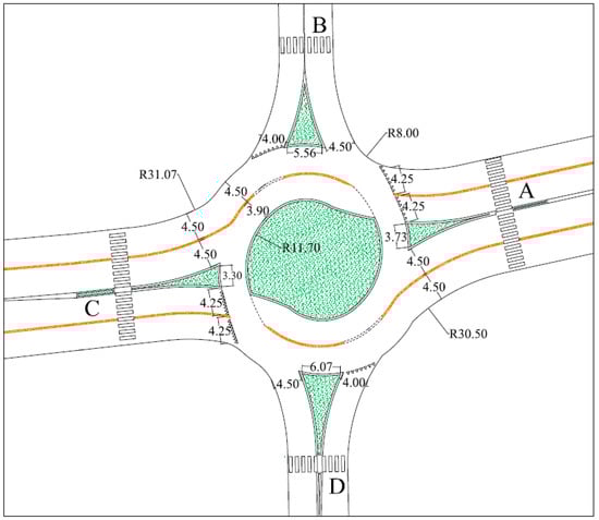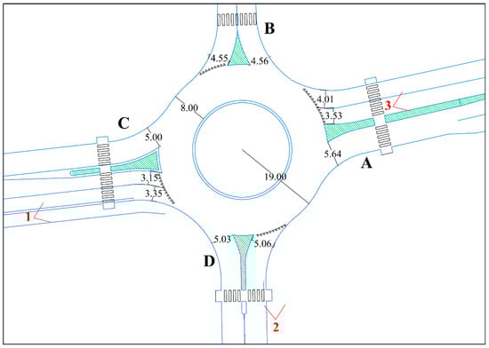 Therefore, we decided to convert the case study roundabout into an egg turbo roundabout: the choice of the turbo-blocks determines the geometric features of the intersection. As reported by Tollazzi et al., “Each block is generated by a formation of all the necessary radii, which must be rotated in a certain way, in order to obtain the different traffic lanes. The size of radii of a standard turbo roundabout and the width of the circulatory lane must be selected in order to guarantee a driving speed through the roundabout not exceeding 40 km/h” [34]. Figure 3 shows the geometric attributes of the investigated roundabout after its transformation into an egg turbo roundabout.