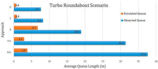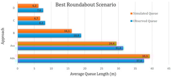 Considering the best scenario, the percentage deviation of each entry between field-measured and simulated queue lengths ranges between −4.5% and +18.4%, as reported in Figure 5.
