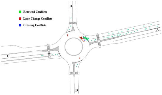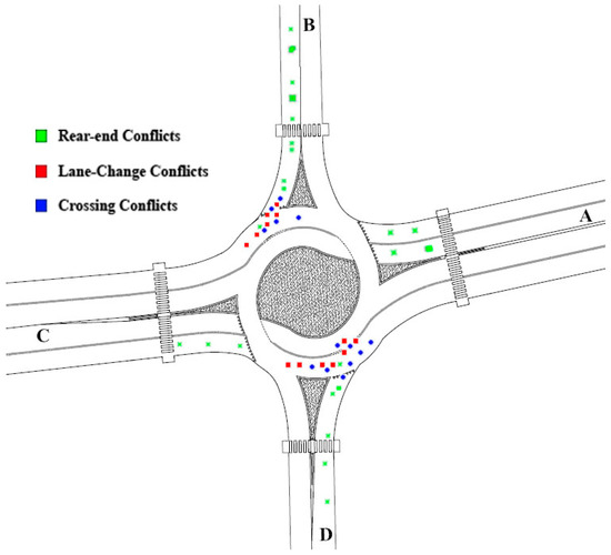Figure 7 shows the spatial distribution of the rear-end, lane-change, and crossing conflicts for the best calibrated roundabout scenario, where different colors identify the various types of conflicts.