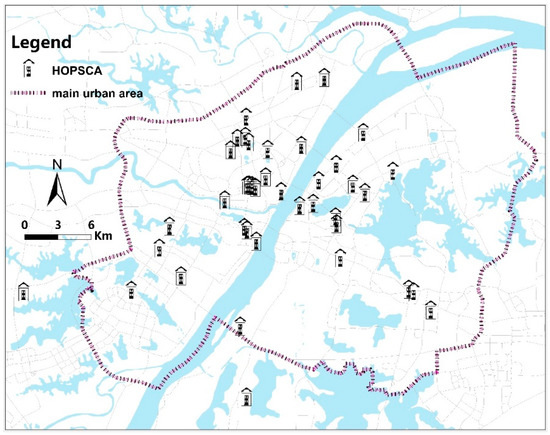 Spatial distribution of the hotels, offices, parks, shopping malls, conference centers, and apartments (HOPSCA) in Wuhan City.